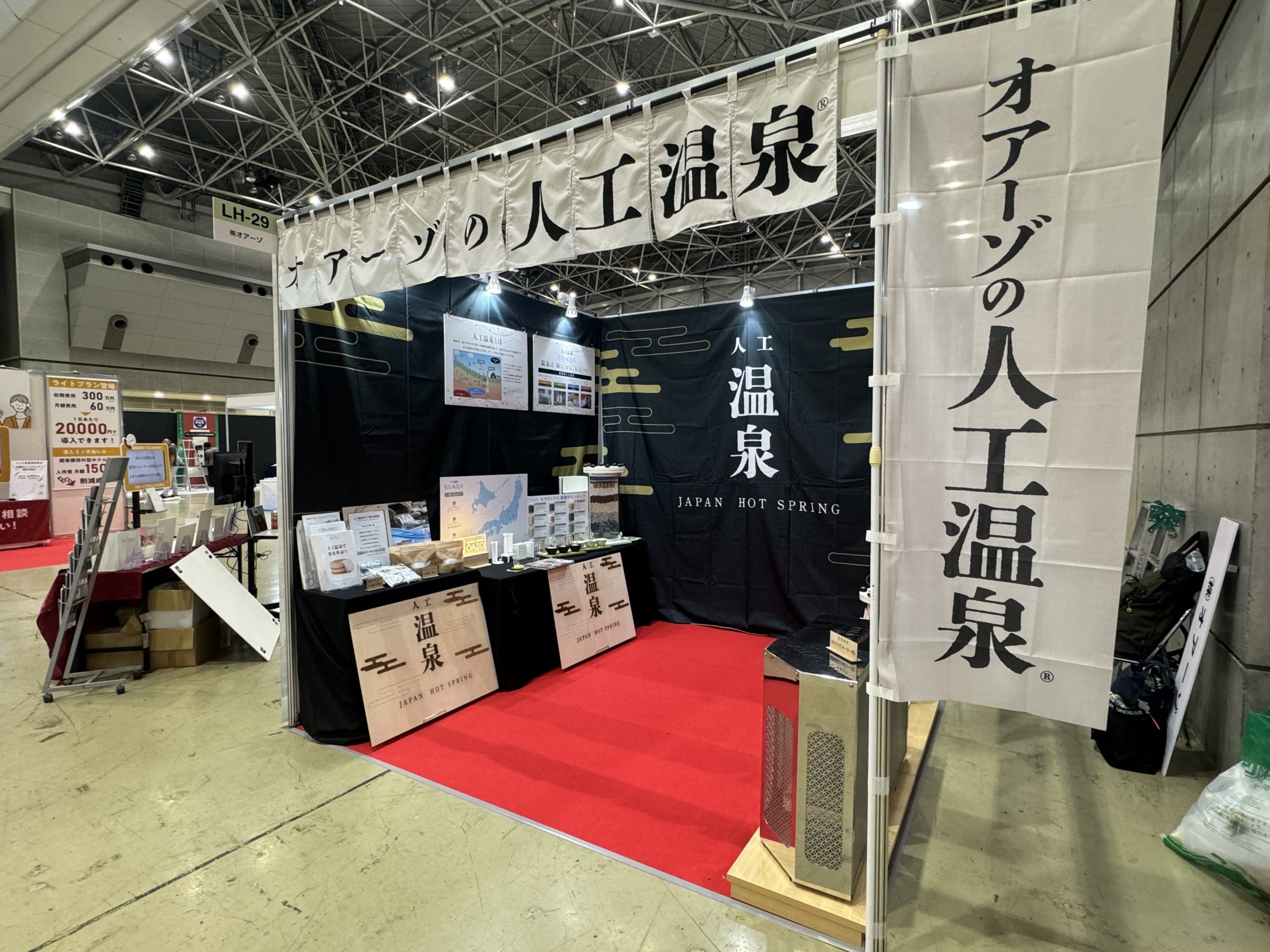 新商品の「Dタイプ」を大きく展示し、のれんで温泉の雰囲気を演出しました。